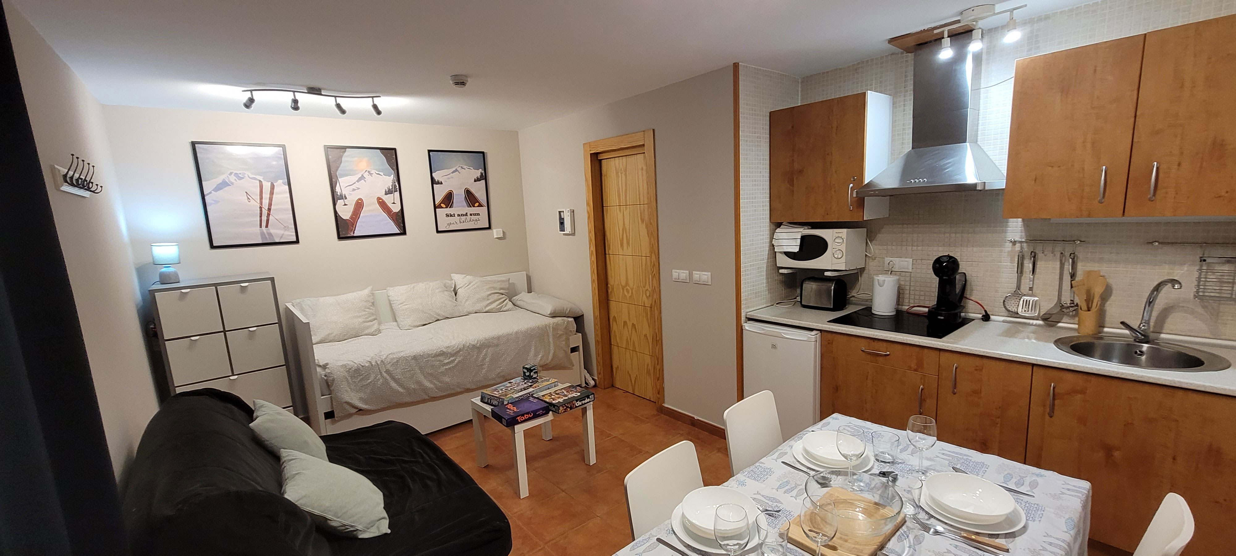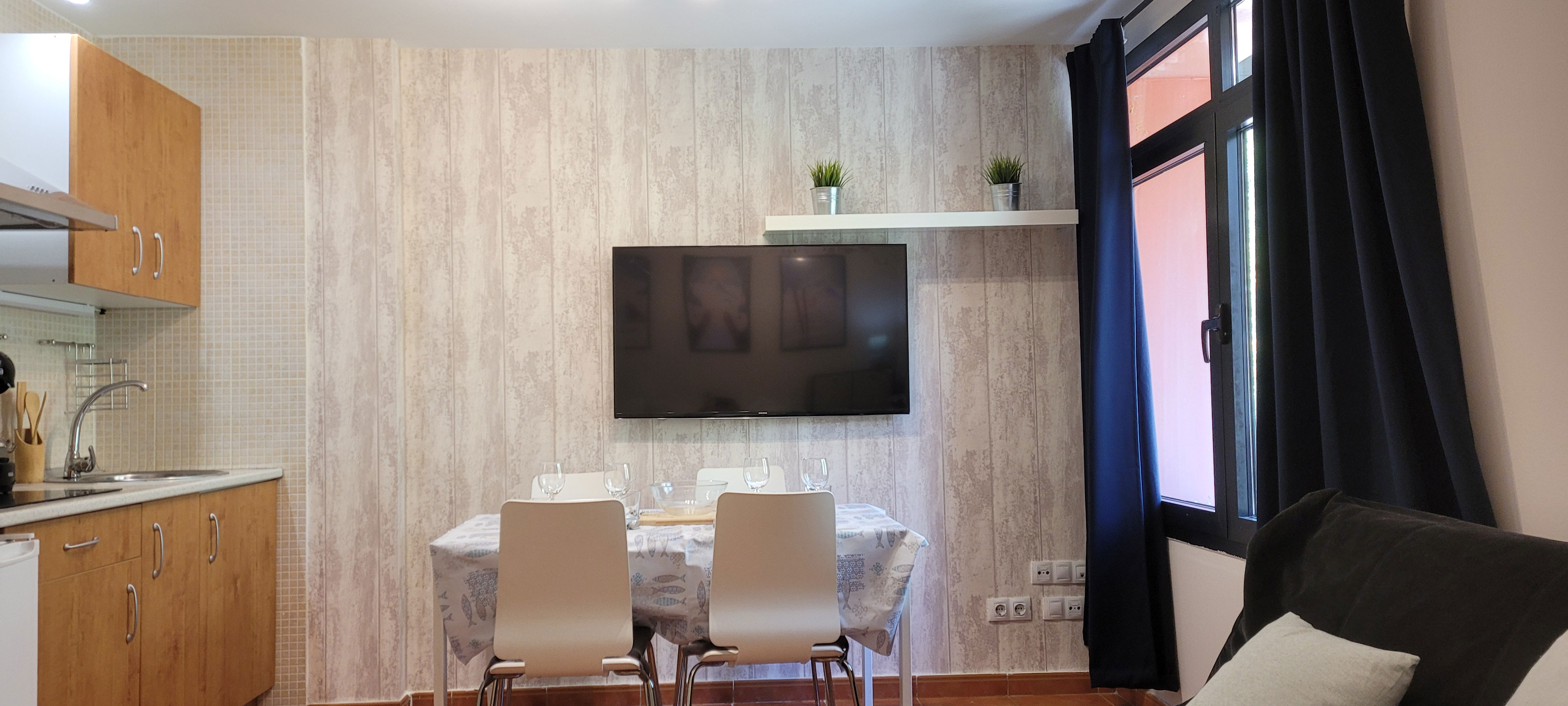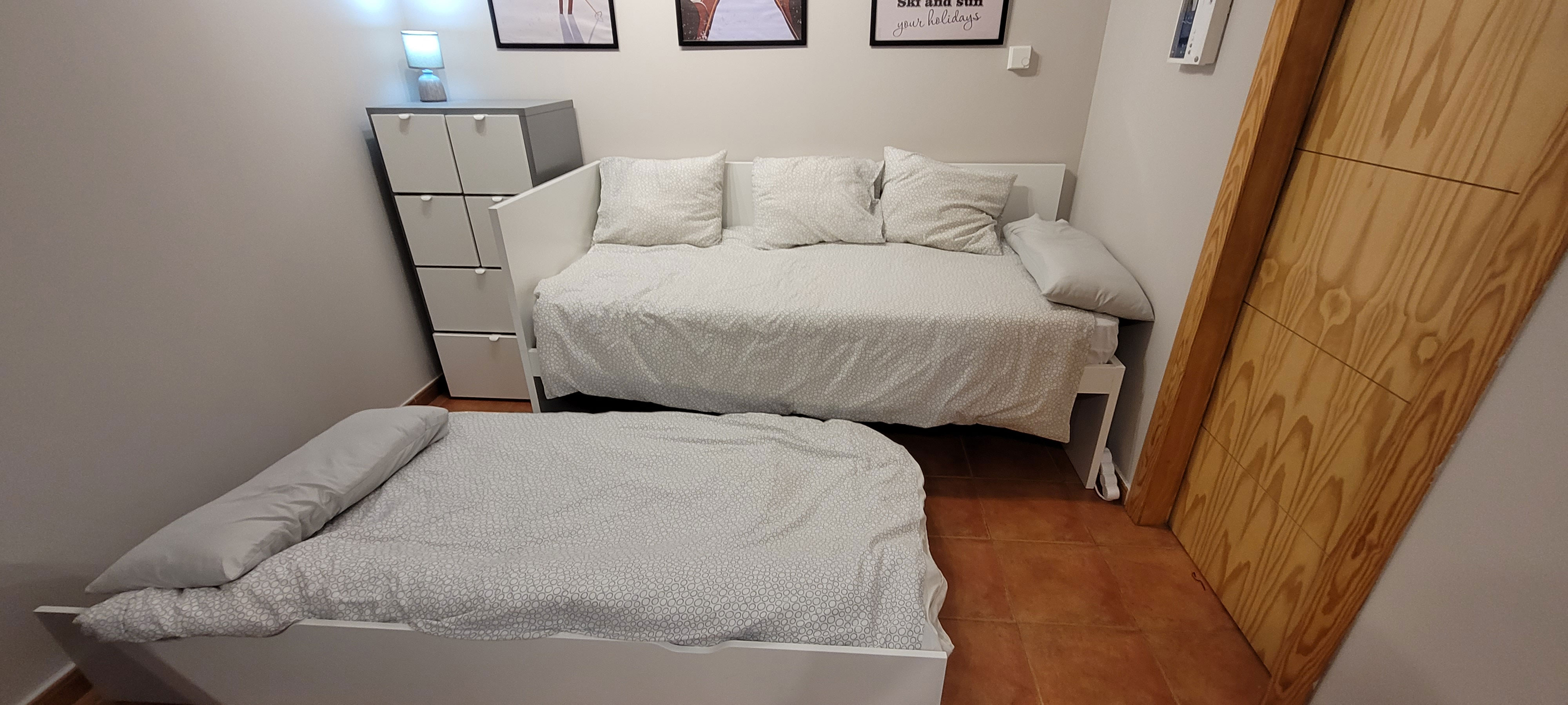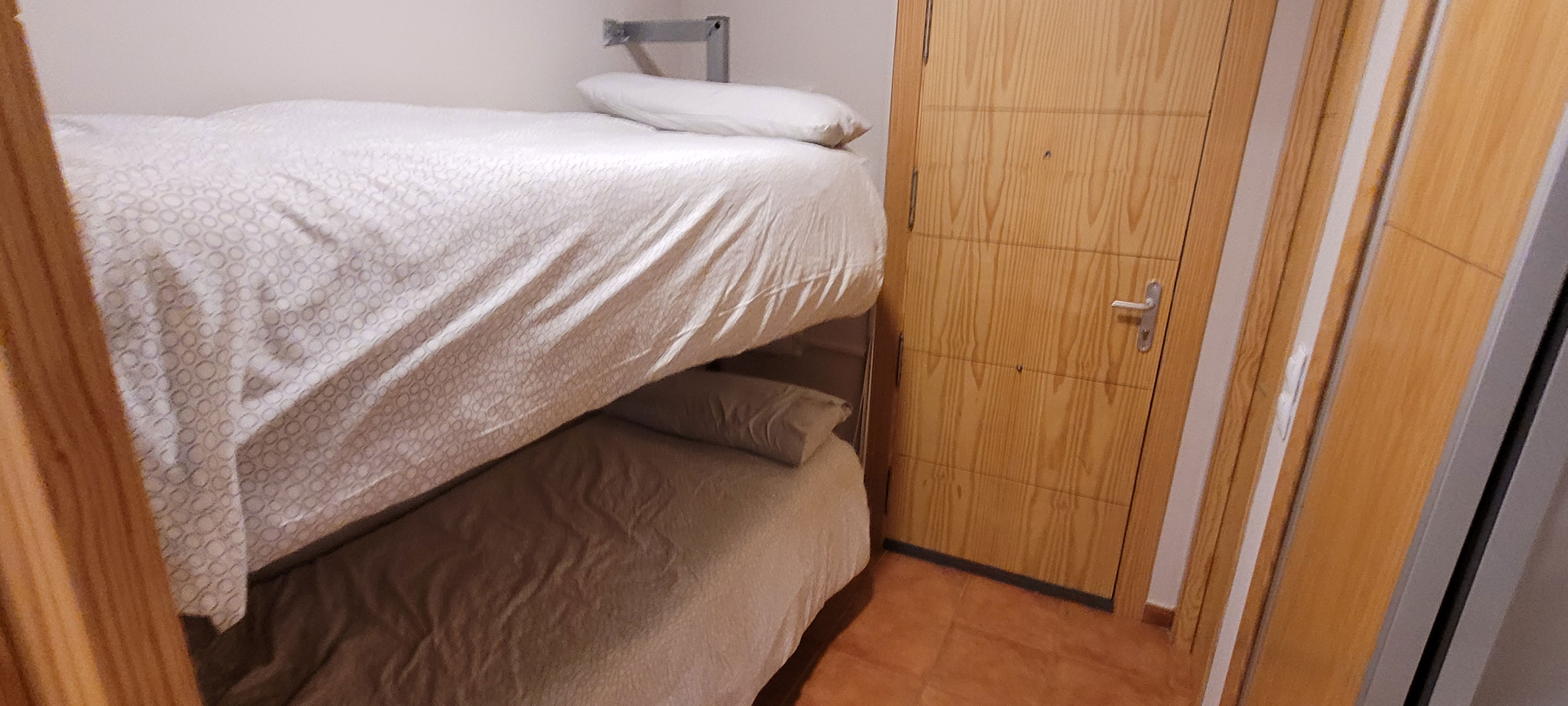 Apartamento con una habitación independiente al salón en la cual hay una litera. El salón cuenta con dos camas individuales. En el salón tiene cocina americana completa y el apartamento tiene cuarto de baño completo con bañera y Wifi.