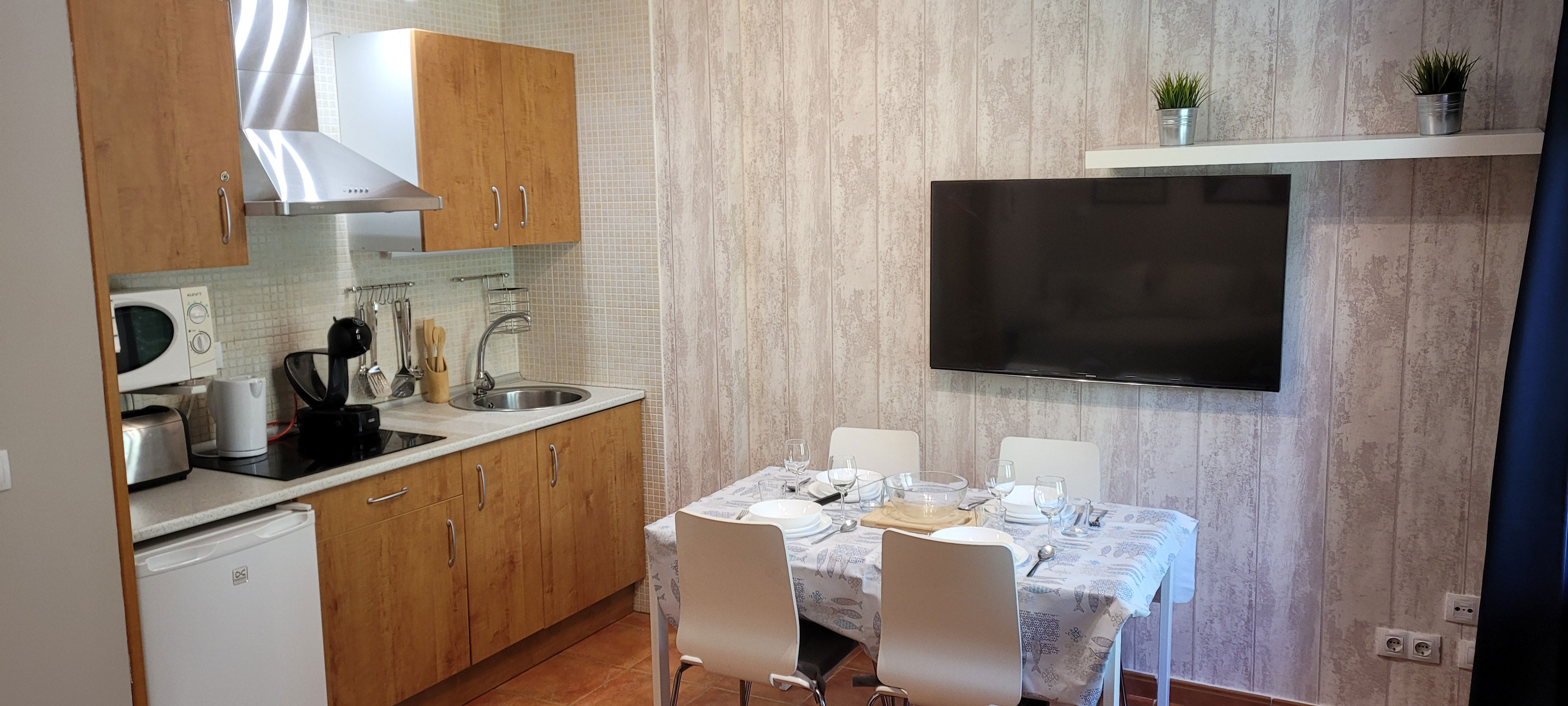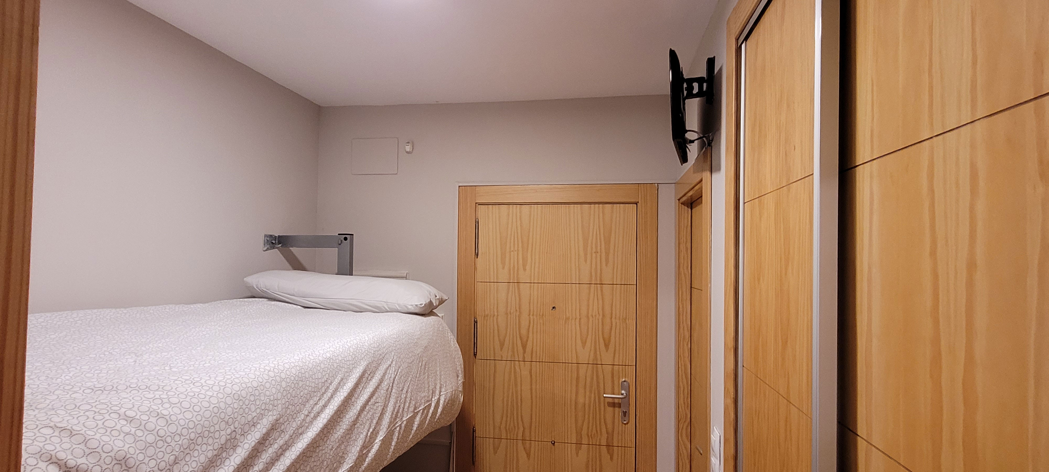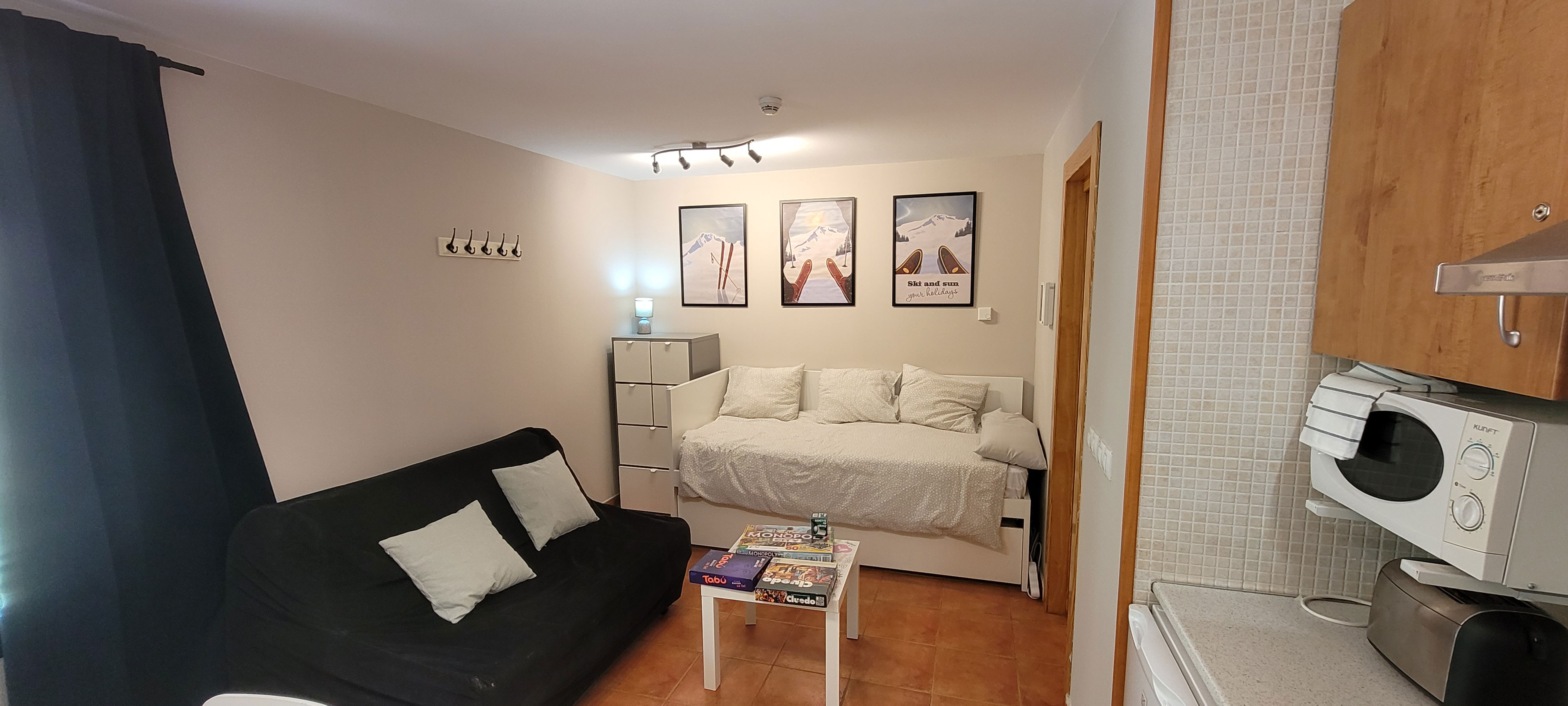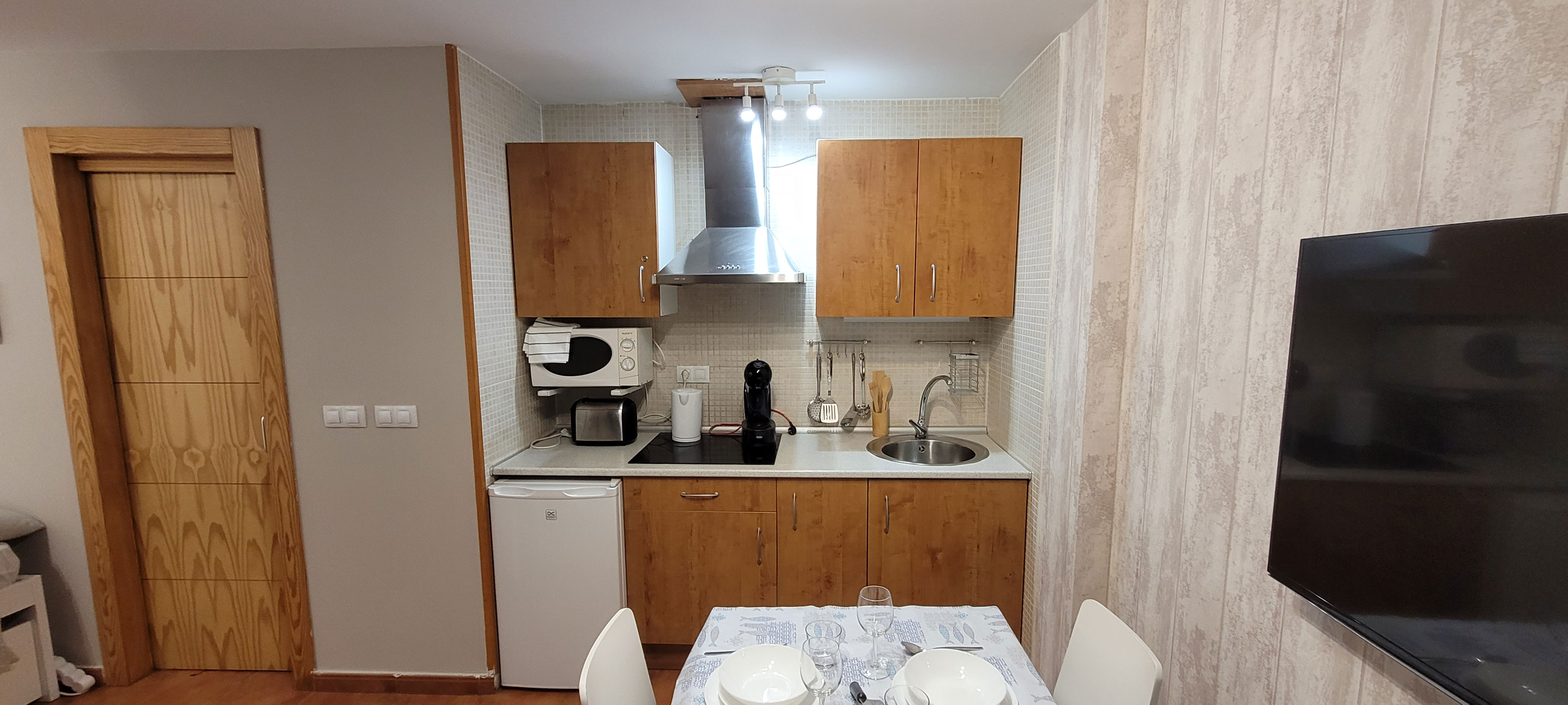 Apartamento con una habitación independiente al salón en la cual hay una litera. El salón cuenta con dos camas individuales. En el salón tiene cocina americana completa y el apartamento tiene cuarto de baño completo con bañera y Wifi.